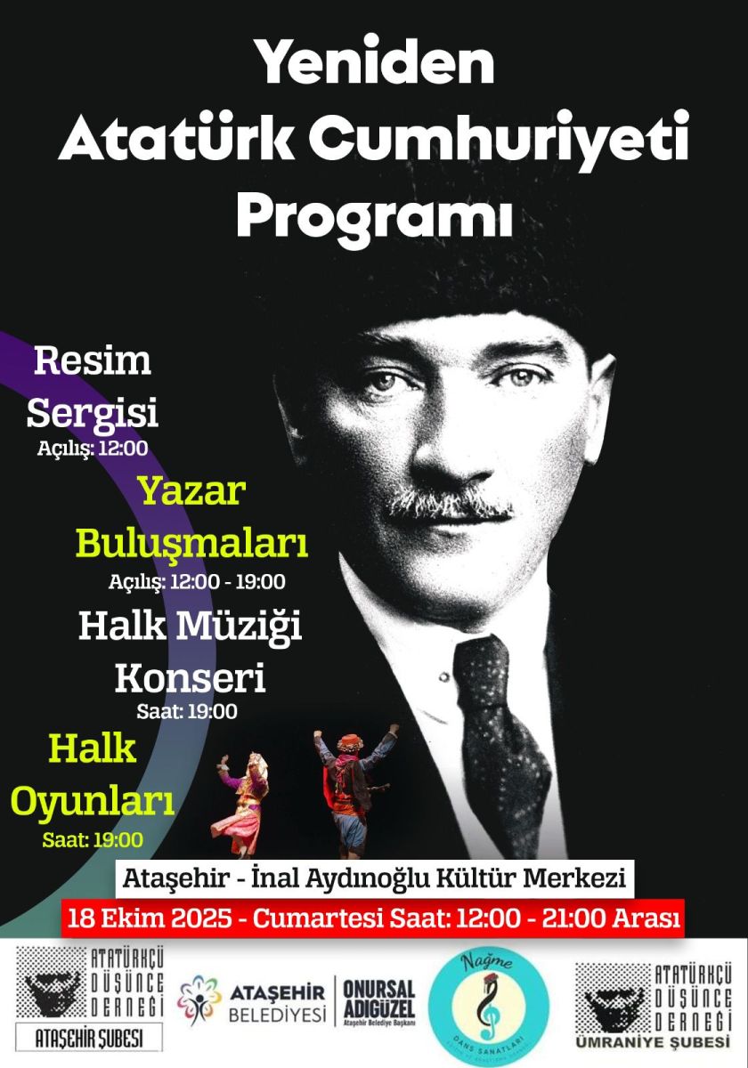 ADD Ataşehir ve Ümraniye şubelerinin birlikte düzenlediği “Yeniden Atatürk Cumhuriyeti” programı saat 12.00’de Resim Sergisi ve Yazarlarla Buluşma etkinlikleriyle başlayacak, saat 19.00’a kadar sürecek bu iki etkinliğin ardından Halk Müziği Konseri ve Halk Oyunları gösterileri sunulacak.