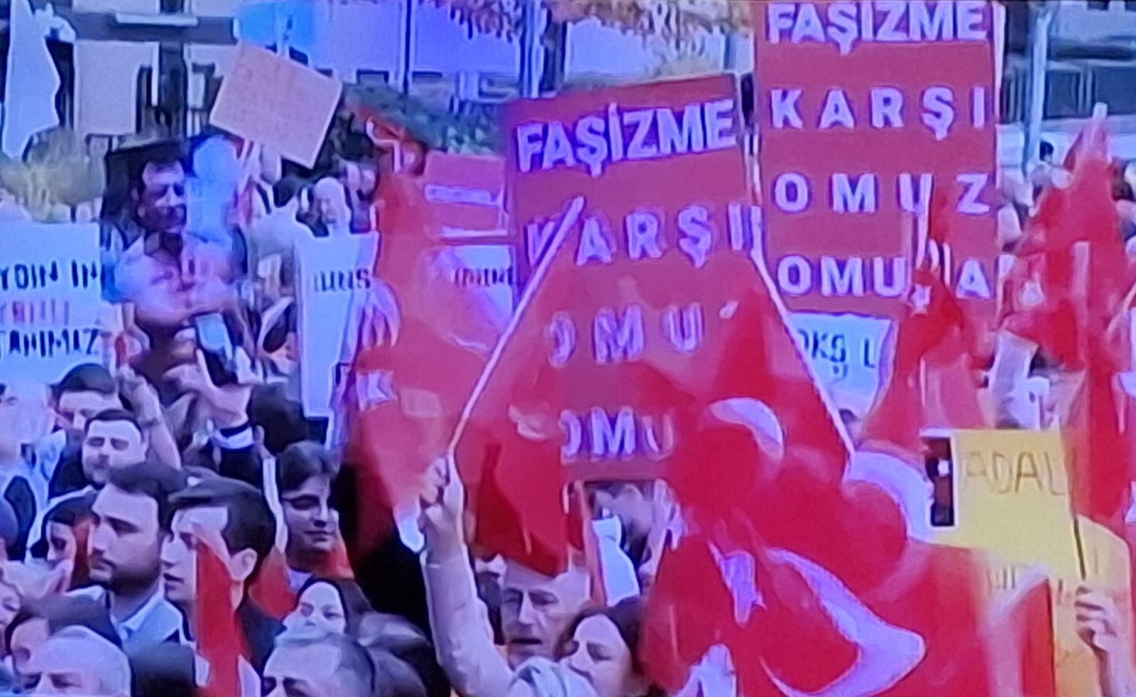“The Nobel Peace Prize 2026 Candidates: İmamoğlu and Özel (2026 Nobel Barış Ödülü Adayları: İmamoğlu ve Özel)”, “Power is rented, we are landllords (Güç kiralıktır, biz ev sahibiyiz)”, “One men to rule them all? No, we want democracy (Her şeyi yönetmek için tek adam? Hayır biz demokrasi istiyoruz)”, “Free İmamoğlu (İmamoğlu’na özgürlük)”, “Democracy can’t be jailed (Demokrasi hapsedilemez)”, “Freedom to the press in Türkiye (Türkiye’deki gazetecilere özgürlük)”, “Speak, stand, defend (Konuş, dur, savun).”