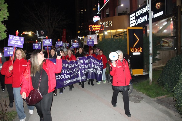 İSTANBUL/ATAŞEHİR (BRTAJANS) - CHP Ataşehir Kadın Kolları, bu akşam, saat 21.00'de Atatürk Mahallesi'nde toplanarak, 8 Mart Dünya Kadınlar Günü nedeniyle bir meşaleli yürüyüş gerçekleştirdi. “Susmuyoruz, Ses Veriyoruz, Eşitlik İçin, Adalet İçin, Özgürlük İçin Yürüyoruz” pankartı açan CHP'li kadınlar, yürüyüş güzergahı boyunca çevrede toplanan ve alkışlarla destek veren halka “Kurtuluş Yok Tek Başına, ya Hep Beraber, ya Hiç Birimiz” sloganı atarken, yönetsel erke karşı “Susmuyoruz, Korkmuyoruz, İtaat Etmiyoruz” diye seslendi.