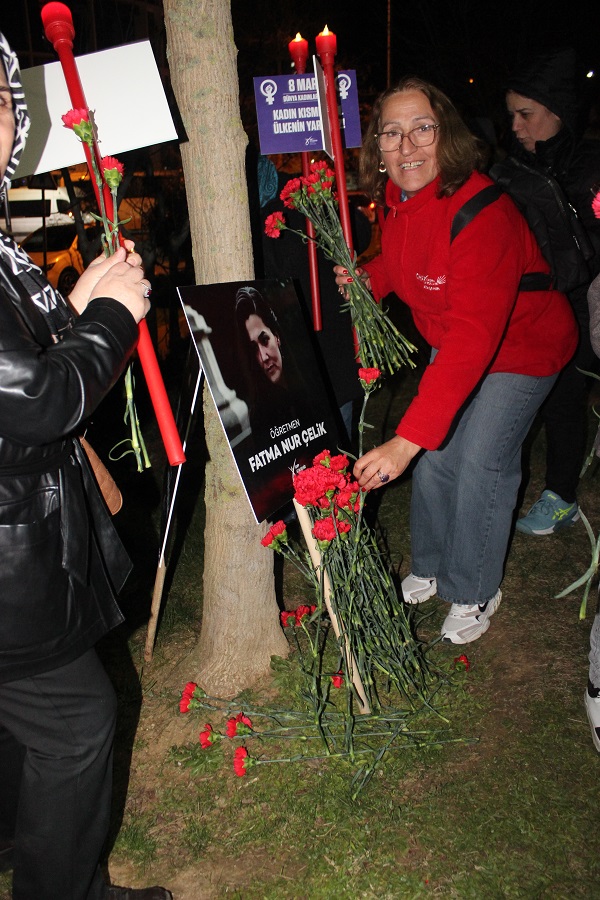 Çiçeğin konuşmasının ardından yürüyüşe katılan kadınlar ve destek için artlarından gelen partililer parka Fatma Nur Çelik'in dövizini dikerek karanfillerle süslediler.
