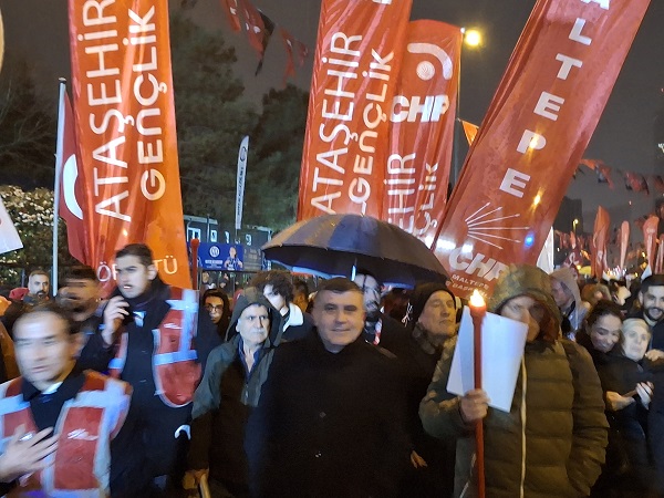 “Bugün 90’ıncı eylem ama İstanbul’da 39 ilçenin 39’uncu ilçe mitingi. Buradan Ataşehir İlçe Başkanımız Anıl Dizdaroğlu’nun şahsında, öncelikle tüm Ataşehir örgütümüze teşekkür ediyorum. Anıl Başkan ile birlikte teker teker ismini şimdi sayamayacağım 39 ilçe başkanımıza, yönetimlerine, üyelerimize ve onların organizasyonlarıyla 39 sefer bizi mahcup etmeyen tüm İstanbullulara yürekten bir dayanışma için yürekten teşekkür ediyorum. Şunu bilin ki gizli gizli bu meydanı izleyen biri var. Hani o perdenin arkasından baktığı gibi Halk TV’ye bakan, Sözcü TV’ye bakan ve bu meydana bakan biri var. Ben eğer bakıyorsa canlı yayında sesleniyorum Erdoğan’a. Bakmıyorsa İletişim Başkanı’na sesleniyorum. Bu görüntülere iyi bakın. Bu kara, bu yağmura, bu meydana iyi bakın. Bu inanmışlığa iyi bakın. Ona göre bu millete, bu milletin seçtiğine el uzatırken, dil uzatırken ayağınızı denk alın. ‘Bundan sonra ne olacak?’ diyenlere… Şunu bilin. Mücadele asla durmayacak. Bu gece 39’uncu miting ama bu hikaye burada bitmeyecek. Önce İstanbul’da üçüncü bölgede, sonra ikinci bölgede, sonra bir kez daha birinci bölgede büyük bölge mitingleriyle; ardından 18 Mart’ı 19 Mart’a bağlayan gece hep birlikte büyük zulmün yıl dönümünde meydandayız, eylemdeyiz. ‘Yine kitapları, türküleri ve bayraklarıyla geldiler. Dalga dalga aydınlık oldular. Yürüdüler karanlığın üstüne. Meydanları zapt ettiler yine. Daha gün o gün değil. Dinleyin, asla dürülmesin bayraklar. Dinleyin, duyduğunuz çakalların ulumasıdır. Safları sıklaştırın çocuklar. Bu kavga faşizme karşı, bu kavga hürriyet kavgasıdır.’ Elindeki bayrağıyla, yüreğiyle buraları dolduran ve bundan sonrası için dosta güven, olmayana kaygı verenlere; bundan sonrası için ‘Arkanda kim var?’ diye sorana, ‘Onun arkasında ben varım. Millet var’ diyenlere helal olsun.”
