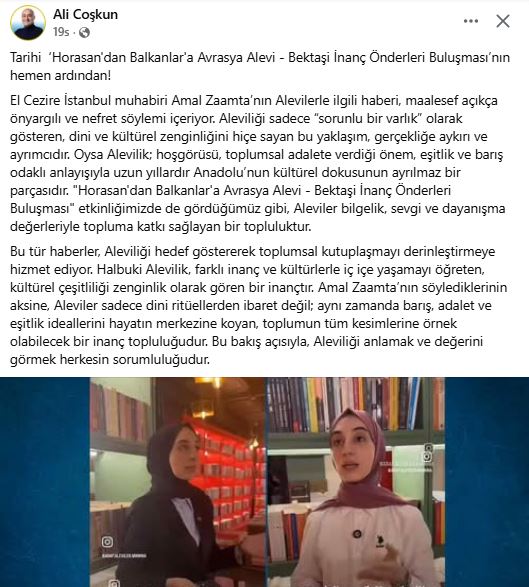 El Cezire İstanbul muhabiri Amal Zaamta’nın Alevilerle ilgili haberi, maalesef açıkça önyargılı ve nefret söylemi içeriyor. Aleviliği sadece “sorunlu bir varlık” olarak gösteren, dini ve kültürel zenginliğini hiçe sayan bu yaklaşım, gerçekliğe aykırı ve ayrımcıdır. Oysa Alevilik; hoşgörüsü, toplumsal adalete verdiği önem, eşitlik ve barış odaklı anlayışıyla uzun yıllardır Anadolu’nun kültürel dokusunun ayrılmaz bir parçasıdır. "Horasan'dan Balkanlar'a Avrasya Alevi - Bektaşi İnanç Önderleri Buluşması" etkinliğimizde de gördüğümüz gibi, Aleviler bilgelik, sevgi ve dayanışma değerleriyle topluma katkı sağlayan bir topluluktur.