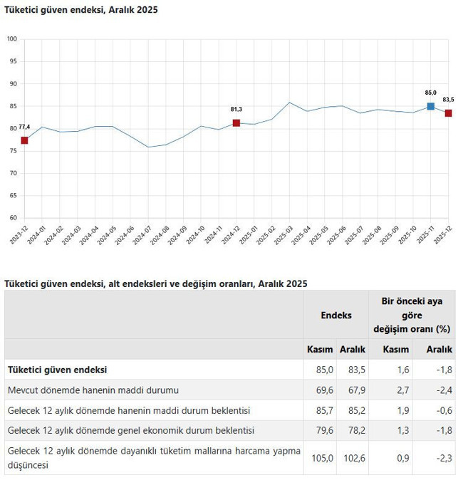 Türkiye İstatistik Kurumu (TÜİK), aralık ayına ilişkin tüketici güven endeksi verilerini açıkladı. Buna göre, TÜİK ve Türkiye Cumhuriyet Merkez Bankası işbirliğiyle yürütülen Tüketici Eğilim Anketi sonuçlarından hesaplanan tüketici güven endeksi, kasımda 85 iken bu ay yüzde 1,8 azalışla 83,5 olarak kayıtlara geçti.