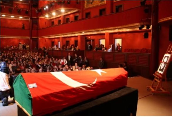 Bahçeşehir Üniversitesi Öğretim üyesi ve emekli Albay Kemal Sayaç'ın "Mustafa Kemal'in Kağnısı" şiirinizi okumasıyla sona erdi Süreyya Operası'ndaki tören. Sahnedeki tabutunuzun önünden saygı ile geçtik ve görevlilerce “omuzlardan omuzlara geçirilirken sarsılmamanıza” özen gösterilerek indirildiniz sahneden.