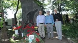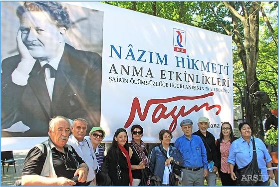 Son iki renkli görsel-Alâettin Bahçekapılı Arşivi (2013 Moskova'daki ölüm yıldömünü töreninde Alâettin Bahçekapılı, Ahmet Özer, Aslan Kavlak, Ruhi Türkyılmaz, Ümit Dönmezbahçekapılı Tarı vb Nâzım sevdalıları)