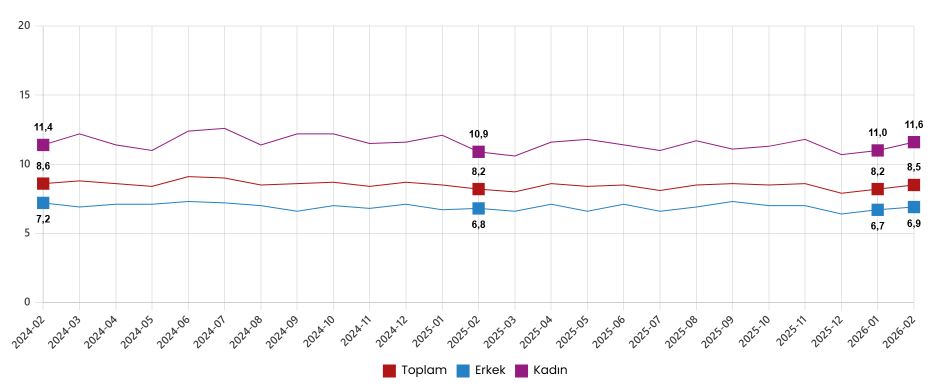 Hanehalkı İşgücü Araştırması sonuçlarına göre; 15 ve daha yukarı yaştaki kişilerde işsiz sayısı 2026 yılı Şubat ayında bir önceki aya göre 133 bin kişi artarak 2 milyon 981 bin kişi oldu. İşsizlik oranı ise 0,3 puan artarak %8,5 seviyesinde gerçekleşti. İşsizlik oranı erkeklerde %6,9 iken kadınlarda %11,6 olarak tahmin edildi.