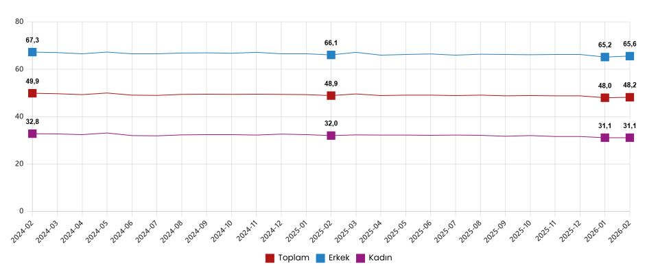 İstihdam edilenlerin sayısı 2026 yılı Şubat ayında bir önceki aya göre 153 bin kişi artarak 32 milyon 158 bin kişi, istihdam oranı ise 0,2 puan artarak %48,2 oldu. Bu oran erkeklerde %65,6 iken kadınlarda %31,1 olarak gerçekleşti.