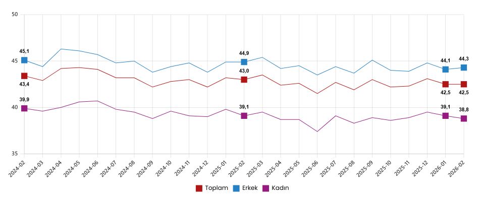 İstihdam edilenlerden referans döneminde işbaşında olanların, mevsim ve takvim etkilerinden arındırılmış haftalık ortalama fiili çalışma süresi 2026 yılı Şubat ayında bir önceki aya göre aynı seviyede kalarak 42,5 saat olarak gerçekleşti.