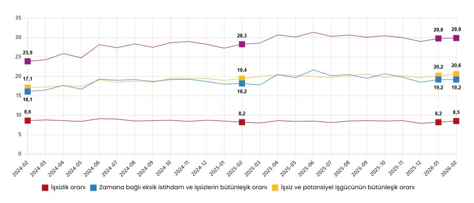Zamana bağlı eksik istihdam, potansiyel işgücü ve işsizlerden oluşan atıl işgücü oranı 2026 yılı Şubat ayında bir önceki aya göre 0,1 puan artarak %29,9 oldu. Zamana bağlı eksik istihdam ve işsizlerin bütünleşik oranı %19,2 iken işsiz ve potansiyel işgücünün bütünleşik oranı %20,6 olarak tahmin edildi.