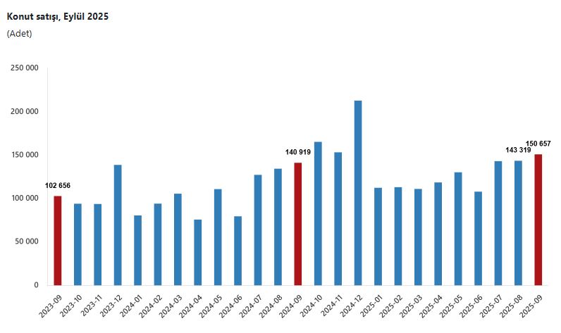 Türkiye genelinde konut satışları Eylül ayında bir önceki yılın aynı ayına göre %6,9 oranında artarak 150 bin 657 oldu. Konut satış sayısının en fazla olduğu iller sırasıyla 24 bin 119 ile İstanbul, 13 bin 417 ile Ankara ve 8 bin 544 ile İzmir olurken, en az olduğu iller sırasıyla 70 ile Ardahan, 117 ile Bayburt ve 142 ile Tunceli olarak gerçekleşti.