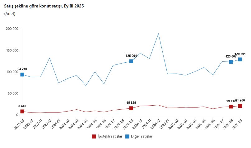 Türkiye genelinde diğer konut satışları Eylül ayında bir önceki yılın aynı ayına göre %3,4 oranında artarak 129 bin 391 oldu. Toplam konut satışları içinde diğer satışların payı %85,9 olarak gerçekleşti. Ocak-Eylül döneminde gerçekleşen diğer konut satışları ise bir önceki yılın aynı dönemine göre %13,0 oranında artarak 966 bin 234 oldu.