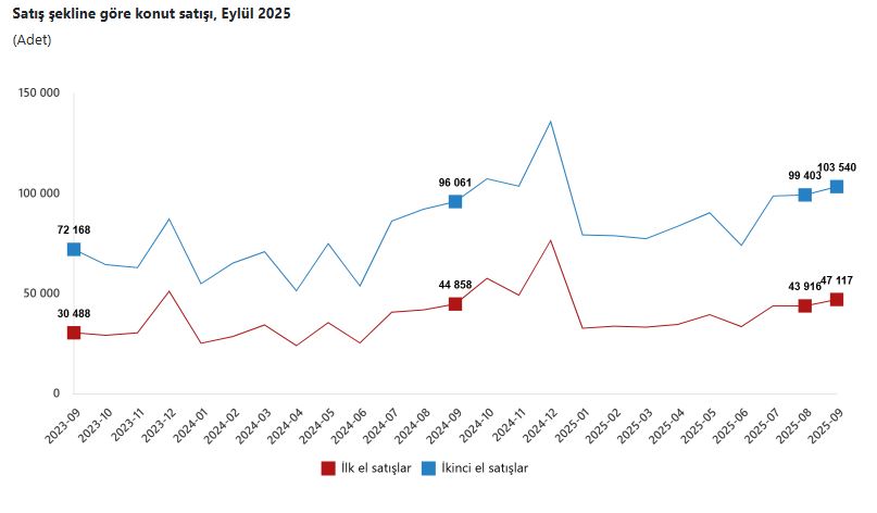 Türkiye genelinde ikinci el konut satış sayısı Eylül ayında bir önceki yılın aynı ayına göre %7,8 oranında artarak 103 bin 540 oldu. Toplam konut satışları içinde ikinci el konut satışının payı %68,7 oldu. İkinci el konut satışları Ocak-Eylül döneminde ise bir önceki yılın aynı dönemine göre %21,6 oranında artarak 786 bin 86 olarak gerçekleşti.