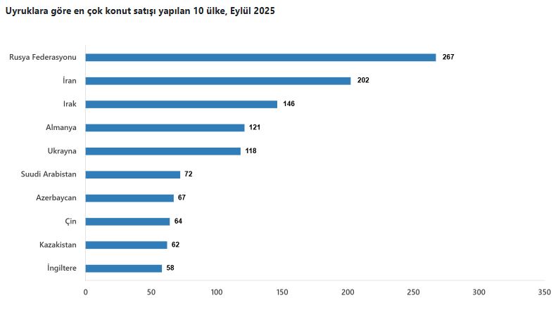 Eylül ayında ülke uyruklarına göre en fazla konut satışı sırasıyla 267 ile Rusya Federasyonu, 202 ile İran ve 146 ile Irak vatandaşlarına yapıldı.