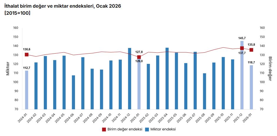 Mevsim ve takvim etkilerinden arındırılmış seriye göre ithalat miktar endeksi; 2026 Aralık ayında 130,6 iken 2026 Ocak ayında %3,0 oranında azalarak 126,7 oldu. Takvim etkilerinden arındırılmış seriye göre ise ithalat miktar endeksi; 2025 yılı Ocak ayında 122,0 iken 2026 yılı Ocak ayında %2,9 oranında azalarak 118,5 oldu.
