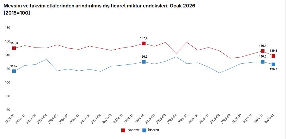 Mevsim ve takvim etkilerinden arındırılmış seriye göre ihracat miktar endeksi; 2026 Aralık ayında 146,4 iken 2026 Ocak ayında %5,0 oranında azalarak 139,1 oldu. Takvim etkilerinden arındırılmış seriye göre ise ihracat miktar endeksi; 2025 yılı Ocak ayında 139,3 iken 2026 yılı Ocak ayında %11,7 oranında azalarak 122,9 oldu.