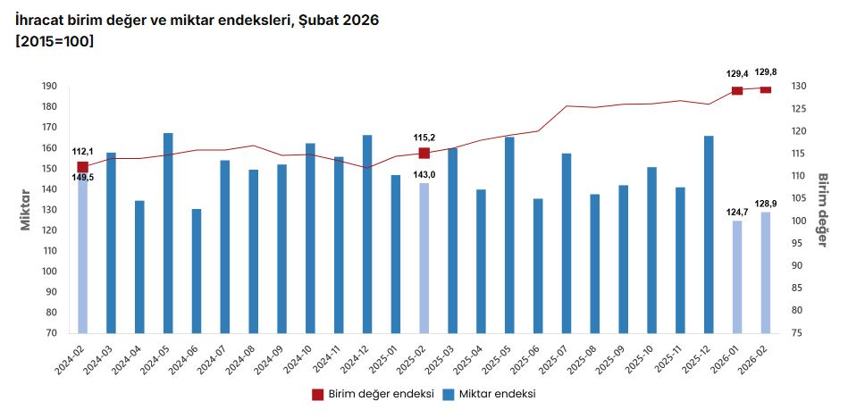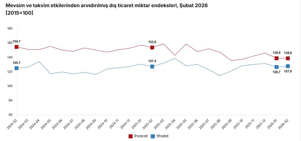 Mevsim ve takvim etkilerinden arındırılmış seriye göre ihracat miktar endeksi; 2026 Ocak ayında 138,9 iken 2026 Şubat ayında %0,1 oranında azalarak 138,8 oldu. Takvim etkilerinden arındırılmış seriye göre ise ihracat miktar endeksi; 2025 yılı Şubat ayında 141,5 iken 2026 yılı Şubat ayında %9,9 oranında azalarak 127,5 oldu.