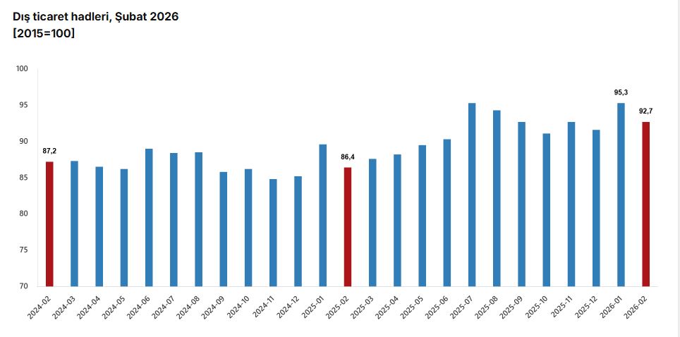 İhracat birim değer endeksinin ithalat birim değer endeksine bölünmesiyle hesaplanan ve 2025 yılı Şubat ayında 86,4 olarak elde edilmiş olan dış ticaret haddi, 6,3 puan artarak, 2026 yılı Şubat ayında 92,7 oldu.