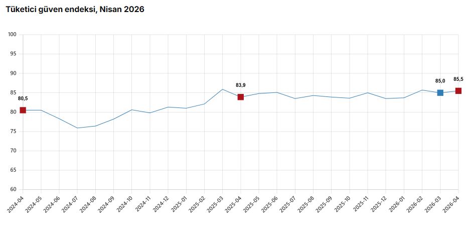 Türkiye İstatistik Kurumu ve Türkiye Cumhuriyet Merkez Bankası işbirliği ile yürütülen tüketici eğilim anketi sonuçlarından hesaplanan tüketici güven endeksi, Mart ayında 85,0 iken Nisan ayında %0,5 oranında artarak 85,5 oldu.